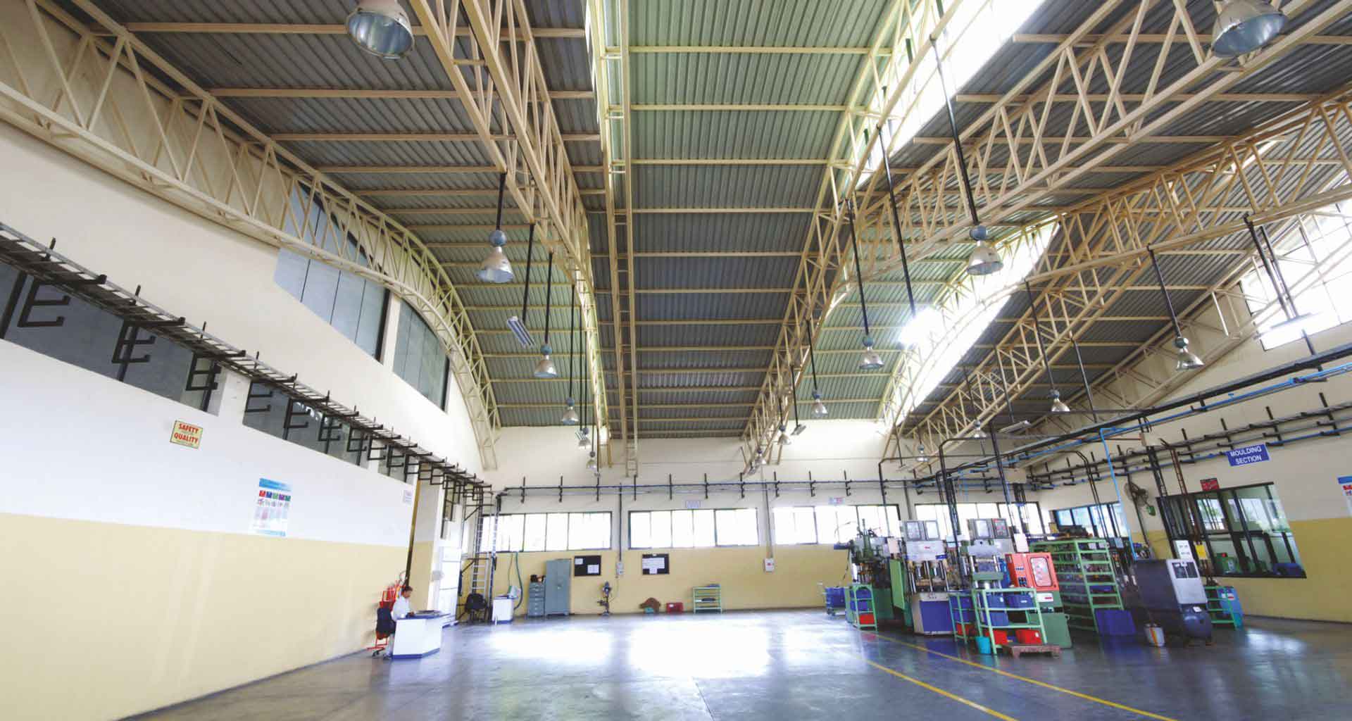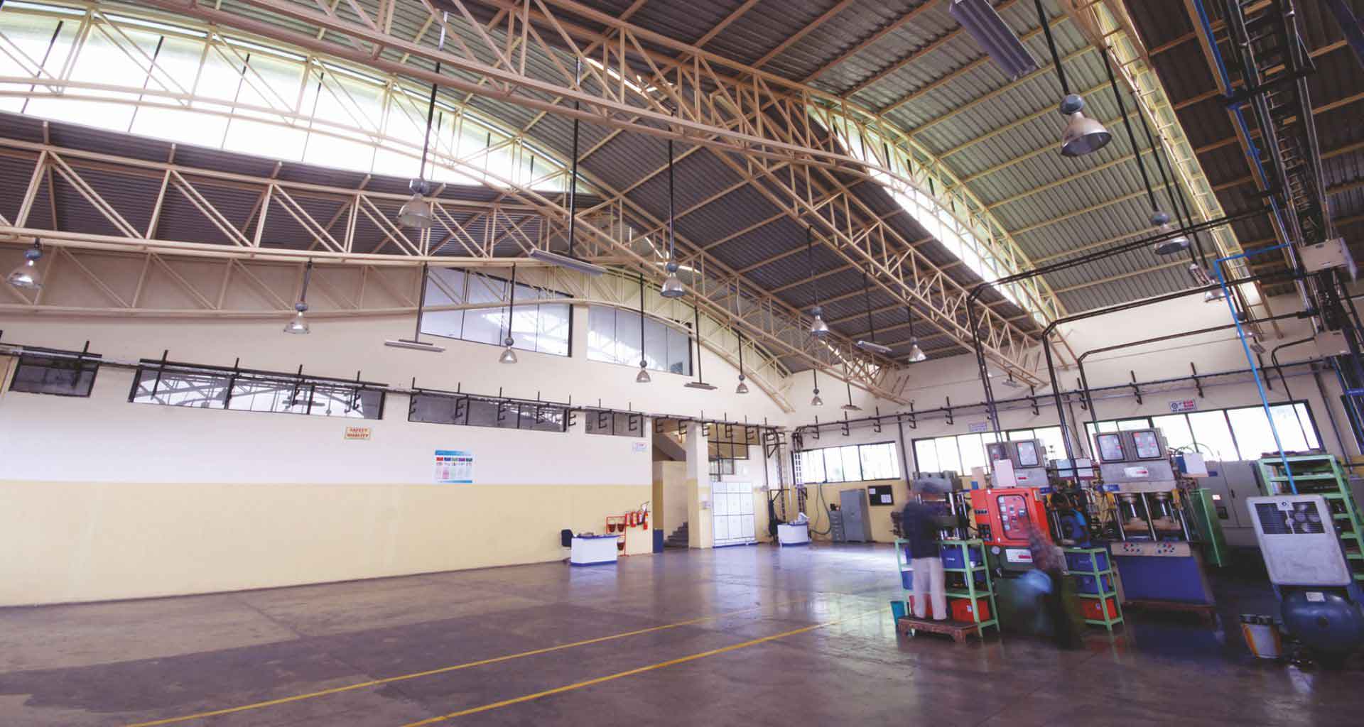 rubber. The mixing plant resembles the hollow of a rubber cylinder. The curved roof lines create an interesting pattern of natural light infusing the shop floor with the brightness of daylight that is rare. Good use of the rising and falling ground is made by entering the office at a higher level. This also allows an excellent view from the office block all the way to the shop floor below.