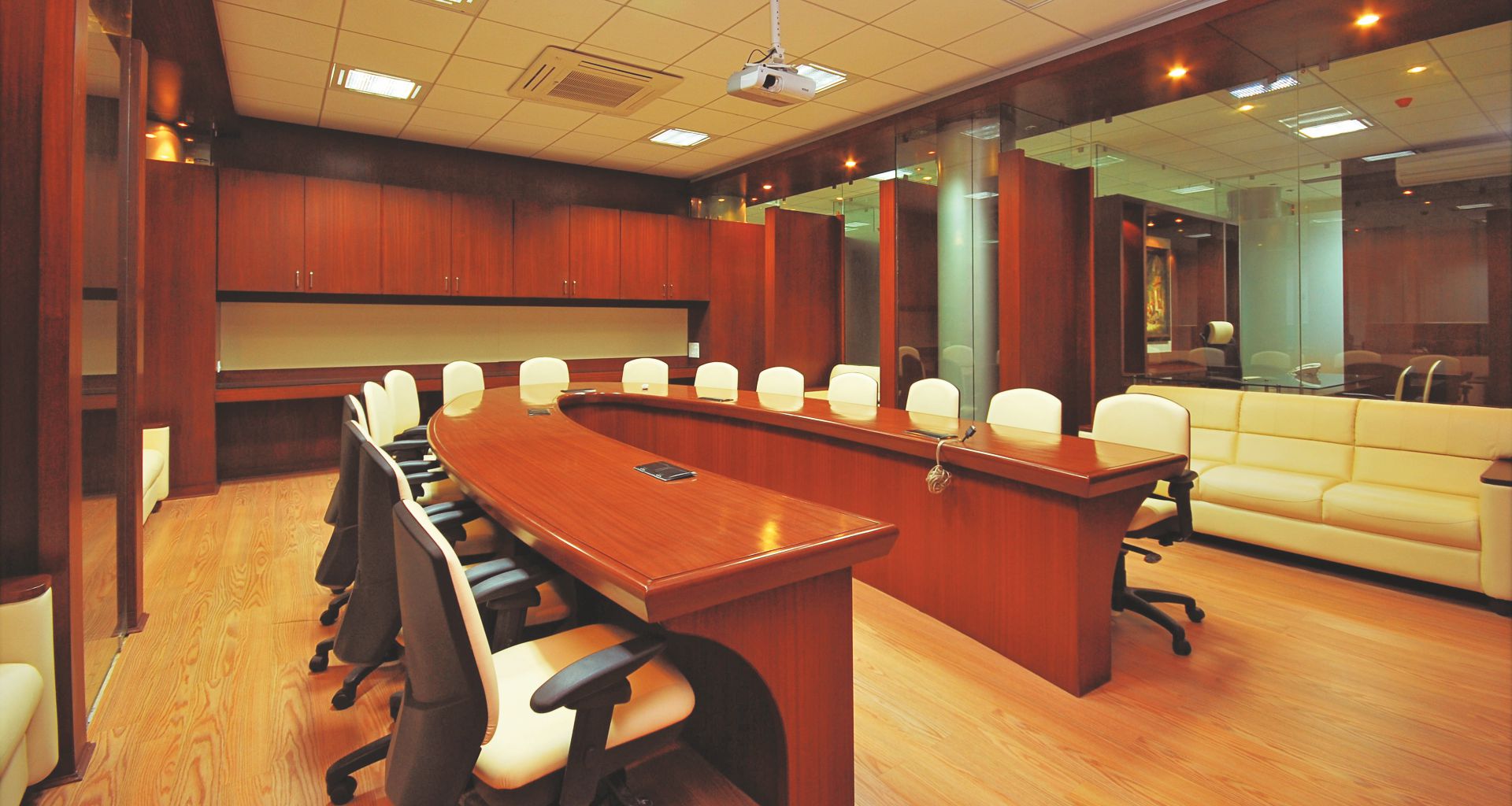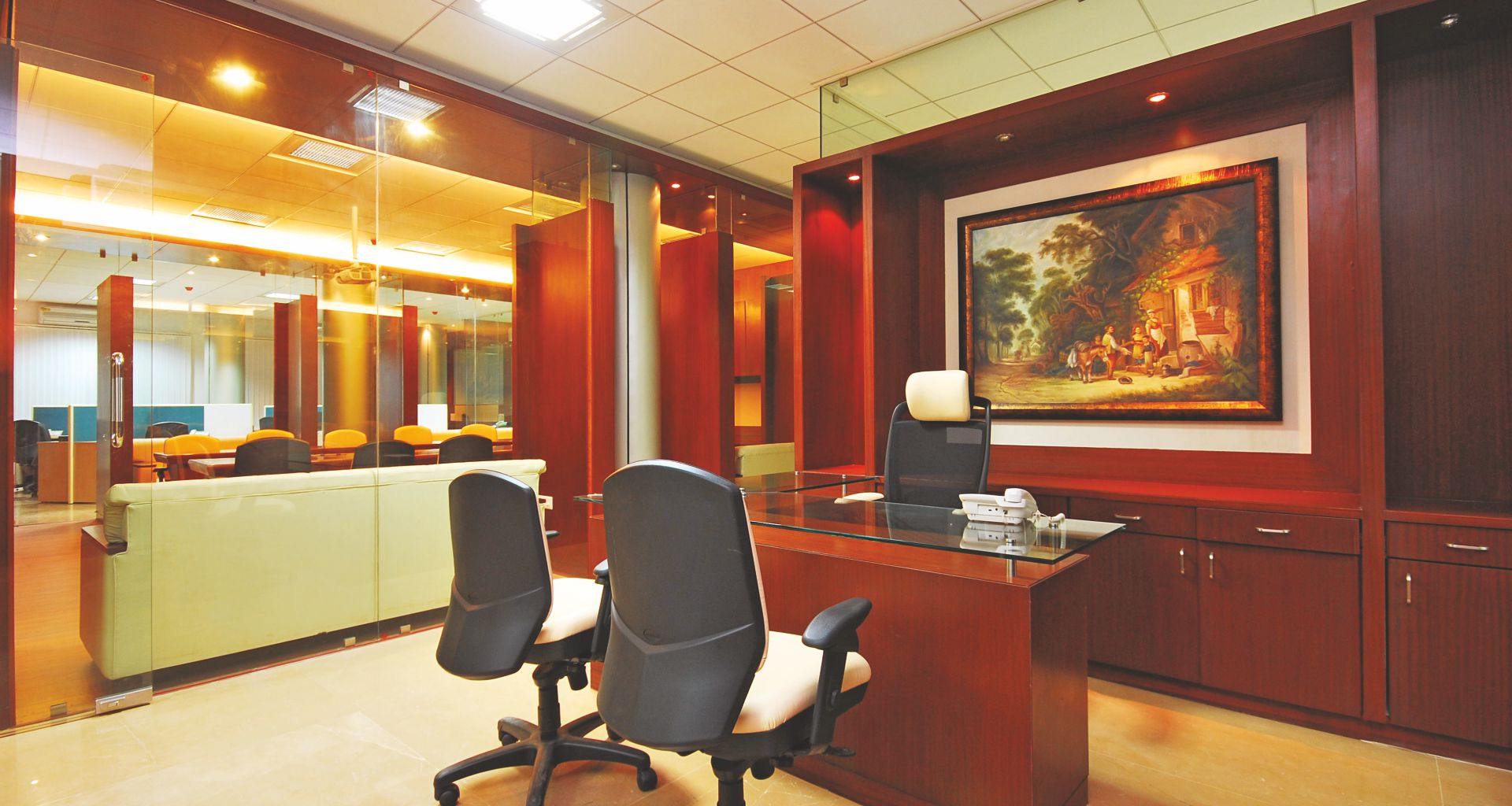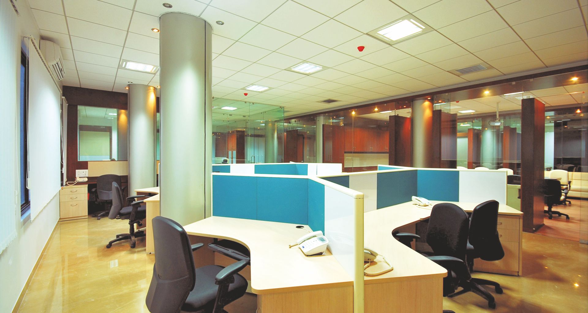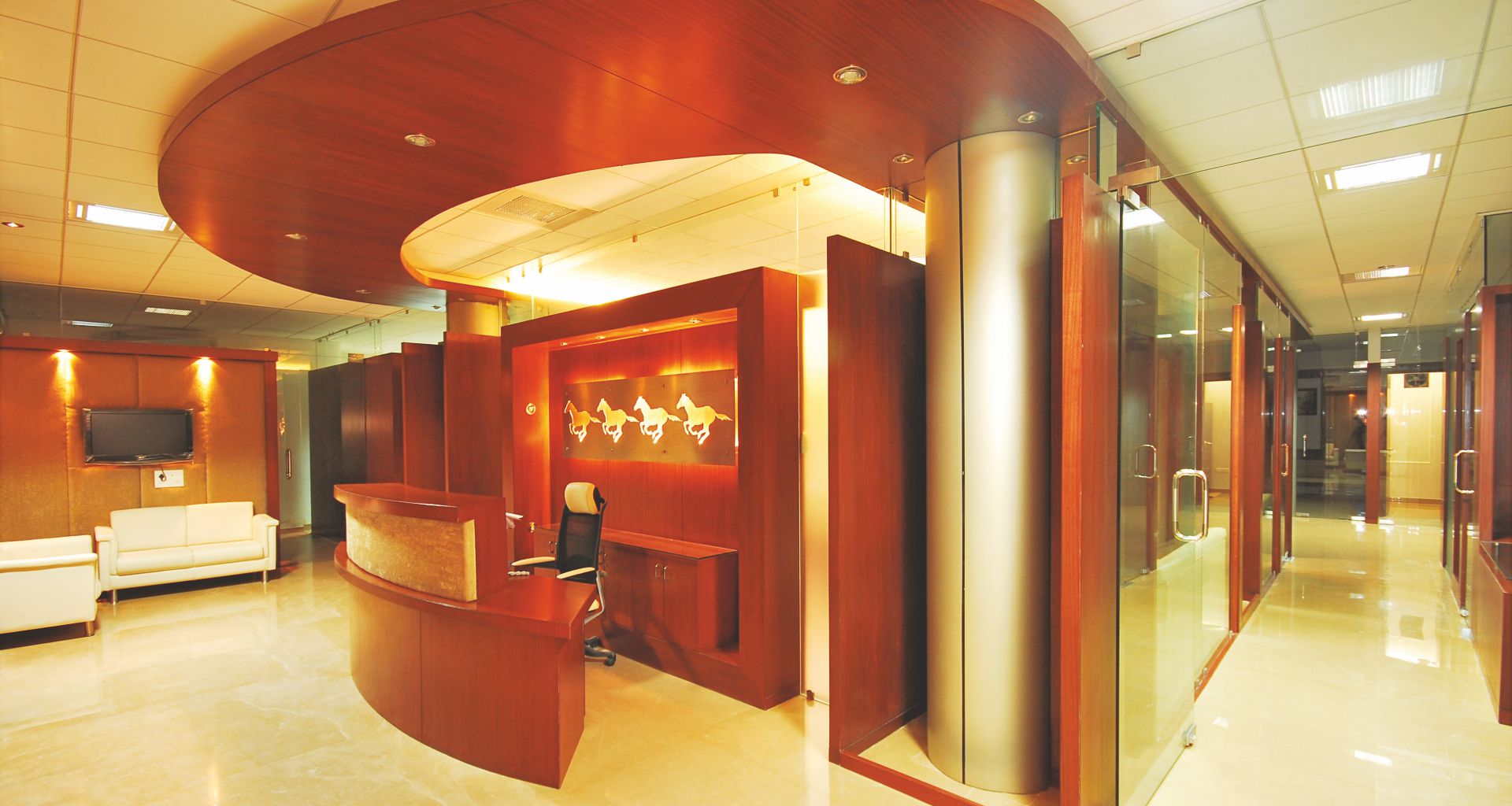 Design Philosophy: The place had huge circular columns. These were exploited to their fullest and converted into a powerful design element that held the central oval disk. This element was used to subtly demarcate the staff and the executive area.