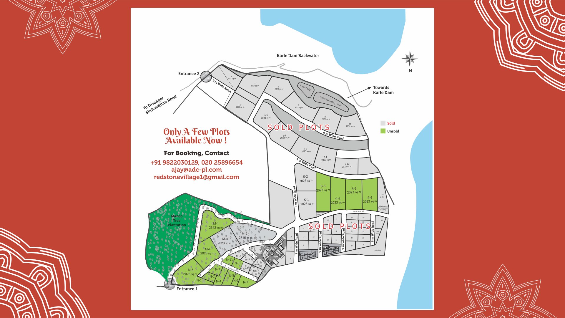The Redstone Village is a gated property and offers complete privacy and security. As you travel through the project, you could experience the wonders that it has to offer like thick vegetation, mango and cashew plantations, exquisite landscaping, a magnificent view of a golden beach with shimmering waters and backwaters of the Karle Dam! The place is resplendent in its Konkani finery and evokes powerful emotions that only Konkan can create.